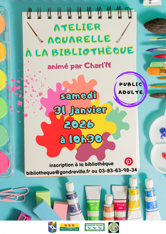 La bibliothèque vous propose un atelier aquarelle pour les adultes, animé par Charl'N, artiste gondrevilloise qui expose régulièrement à la bibliothèque.