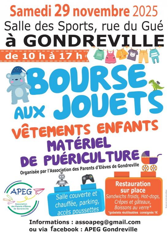 Rendez-vous à Gondreville, près de Nancy, pour une bourse aux jouets, vêtements enfants et matériel de puériculture organisée par l'APEG (Association des Parents d'Elèves de Gondreville) L'occasion de faire le tri dans votre maison et de réaliser de bonnes affaires.