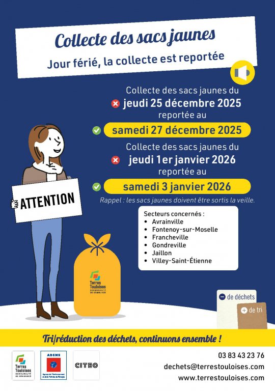 La collecte des sacs jaunes du Jeudi 25 décembre 2025 est reportée au samedi 27 décembre 2025.
